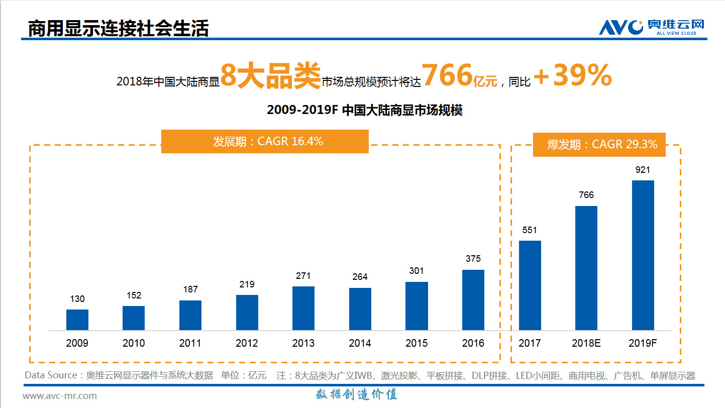 商用显示是物联网时代中最大的一部分公共显示的终端。奥维云网在过去几年中,都把这8个品类暂时的定义为了物联网的商用显示主流品类。在2018年市场总规模会来到766亿元,同比增长39%。这里面包含了电子白板、激光投影、平板拼接、小间距商用电视广告机、单屏显示器等。未来三年,商用显示复合增长率会维持在29%左右,相当不错的水平。
