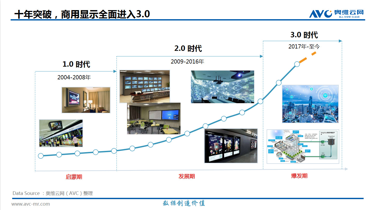 1.0时代,B2B只是B2C的补充出现;2.0时代是商显的蓝海出现了,从2009年开始,很多的家电品牌、很多的专业品牌开始进入到这个领域,在这个时候我们出现了很多的商显品类;到了2017年开始是3.0时代,在这时候是中国商用显示迎来了变革和创新的时代,云计算、大数据、物联网、移动互联网等等,都在催化商显这个产业。