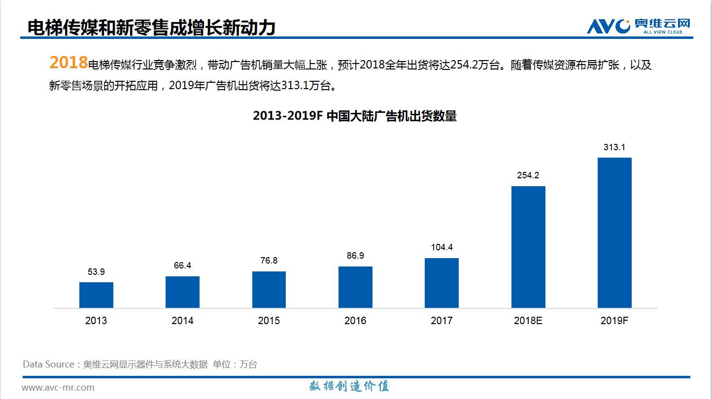 今年的前三季度,由于资本的介入,可以看到2018年广告机的增长非常迅猛,前三季度同比增长了150%的水平,2018年全年预测广告机会来到254.2万台,其中分众传媒和新潮的贡献非常大。2019年,除了电梯传媒,再包括新零售,数字会达到313.1万台水平。