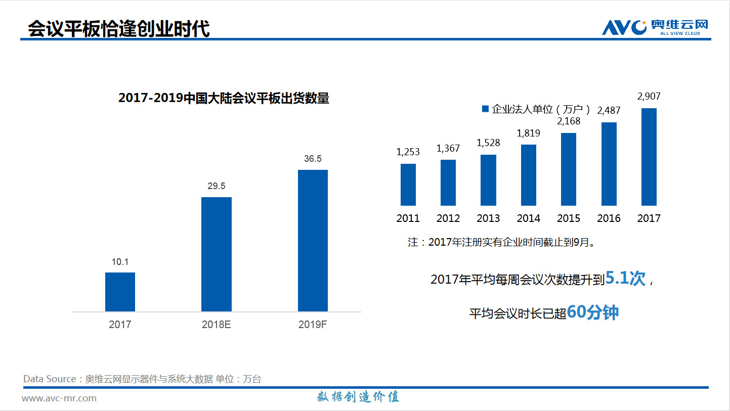 上图右边是实有企业注册的数量,随着「大众创业、万众创新」的浪潮,中国每天都有1.5万家公司诞生,到了2017年已经有2900万个公司,每周的会议次数提到了5.1次,每次的会议来到了60分钟。