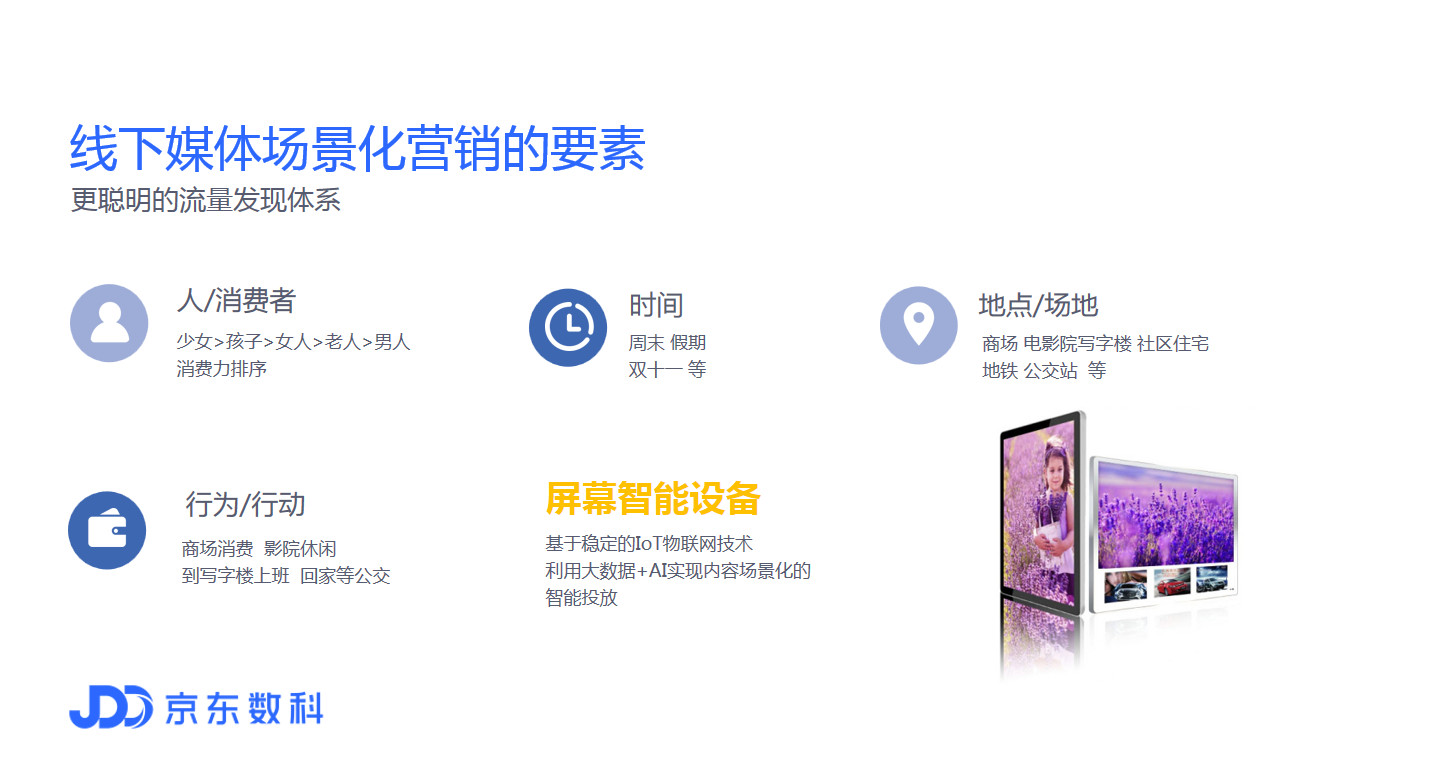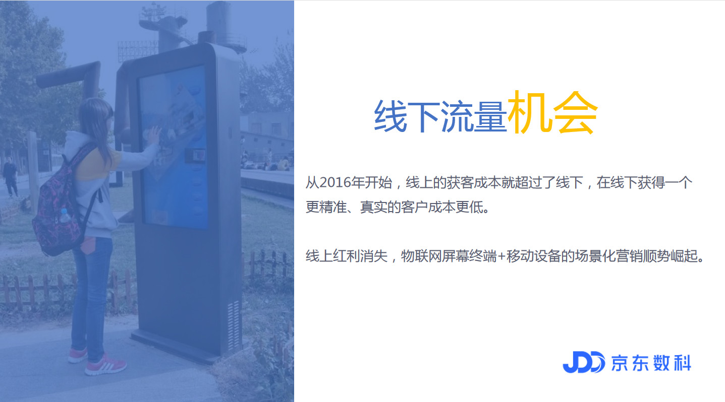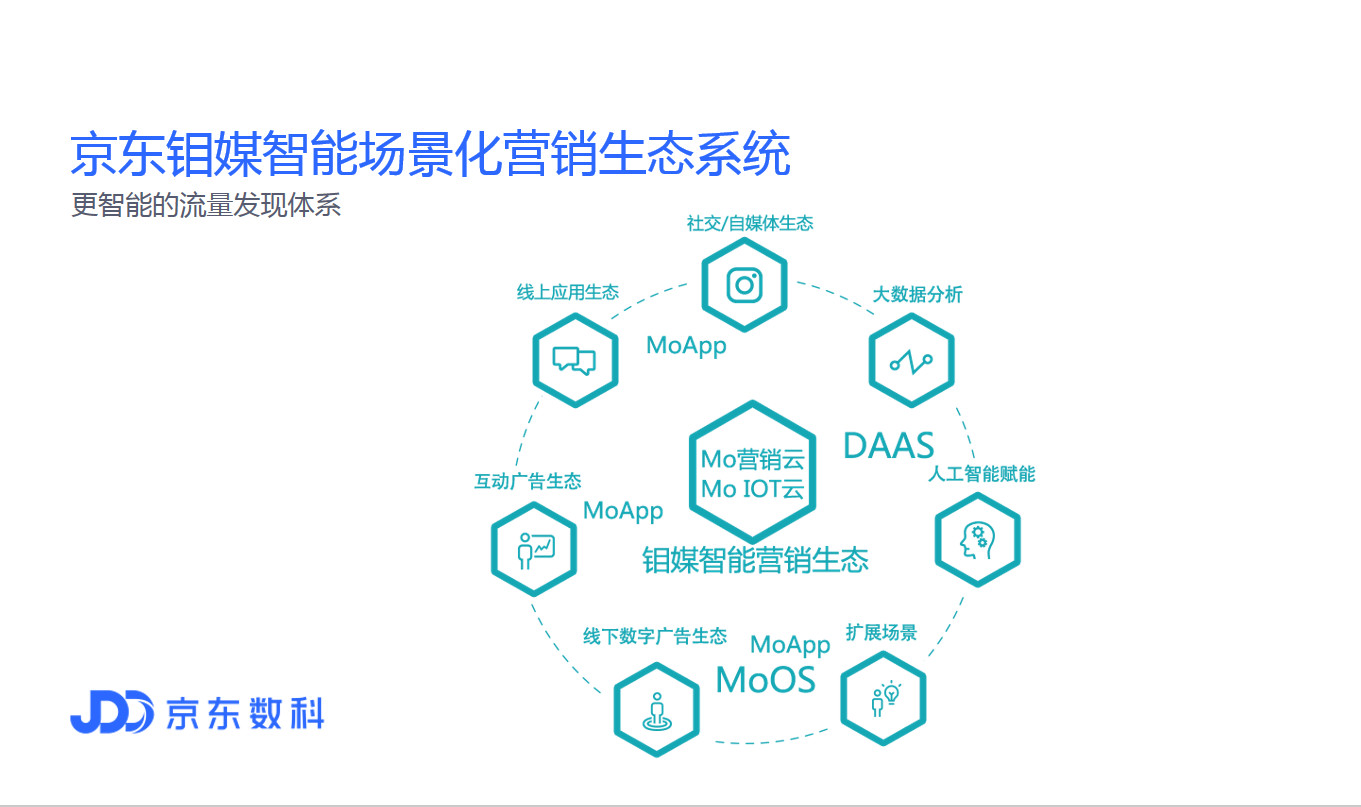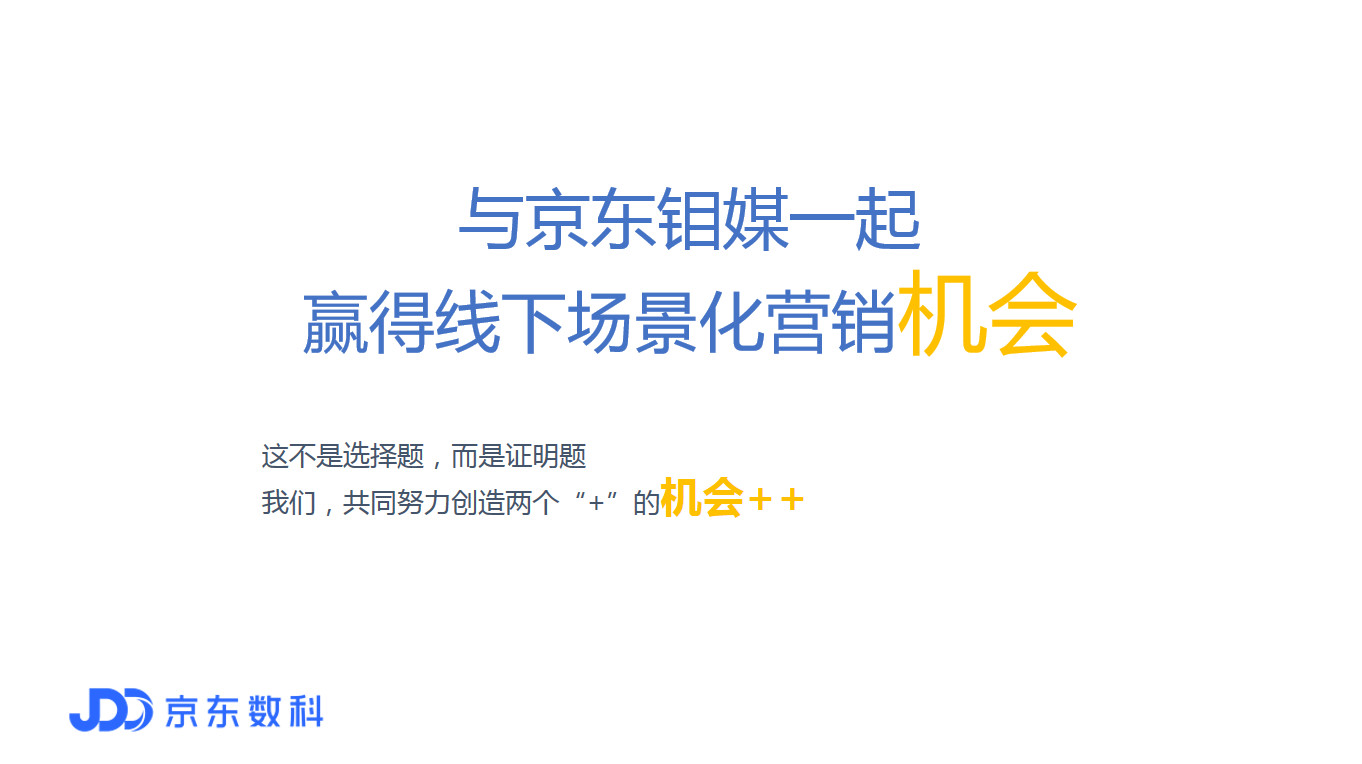 我们这两个方向怎么样能抓住它?我简单介绍一下京东钼媒,京东钼媒是京东数科旗下子品牌,是不久前发布的新品牌,是基于物联网的全新营销服务生态。京东钼媒希望和线下的这次机会,能提供双+合作。