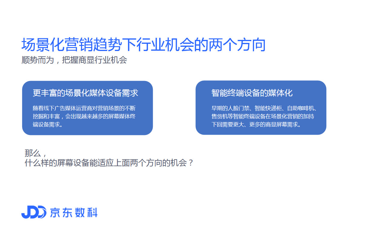 场景化营销的趋势下,行业机会的方向我总结了两点:一是在这种机会下,我们商显行业更应该顺势而为,因为它们有更丰富的场景化媒体设备的需求。再一个是智能设备的媒体化需求,因为商显这个行业不光是纯媒体、不光是广告屏,还有很多功能屏,这种功能屏里面的媒体化需求也是越来越强。