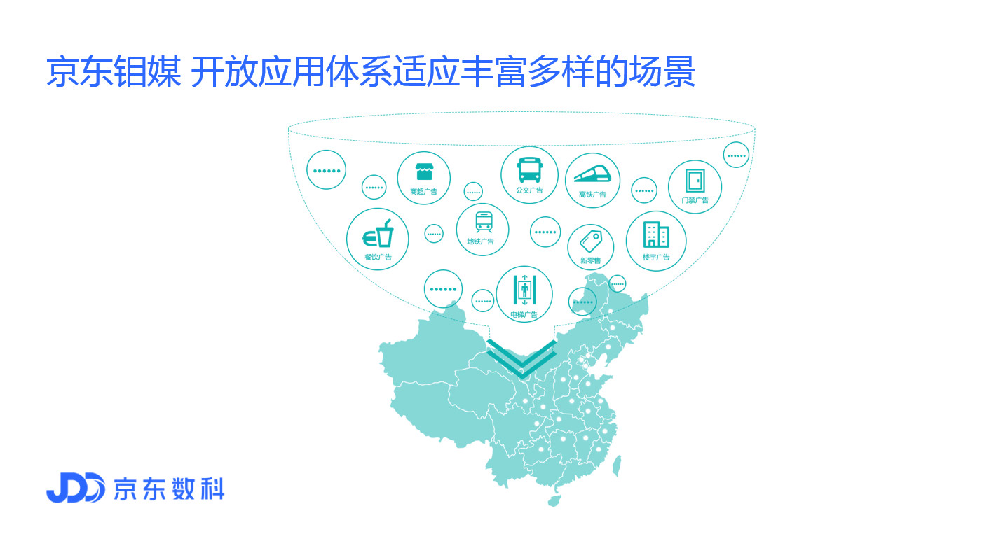京东钼媒开放的生态有哪些?应用包含多种场景,比如说商超的广告、公交的广告、餐饮的广告、电梯的广告、新零售的广告,这都是开放的生态场景之一。