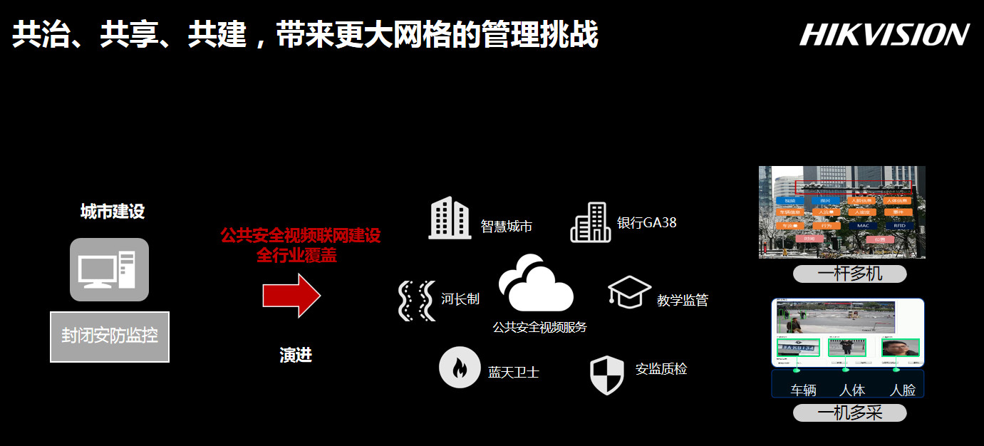 先看一下在网格的建设当中,最早的「平安城市」建设采用是封闭的视频监控,随着智能化的发展,在一些地方推行的河长制、蓝天卫士、智慧安监、智慧教学监管、银行GA38标准,再到智能设备和技术的升级,有很多一机多采、一杆多机的设备,正在产生大量的数据。