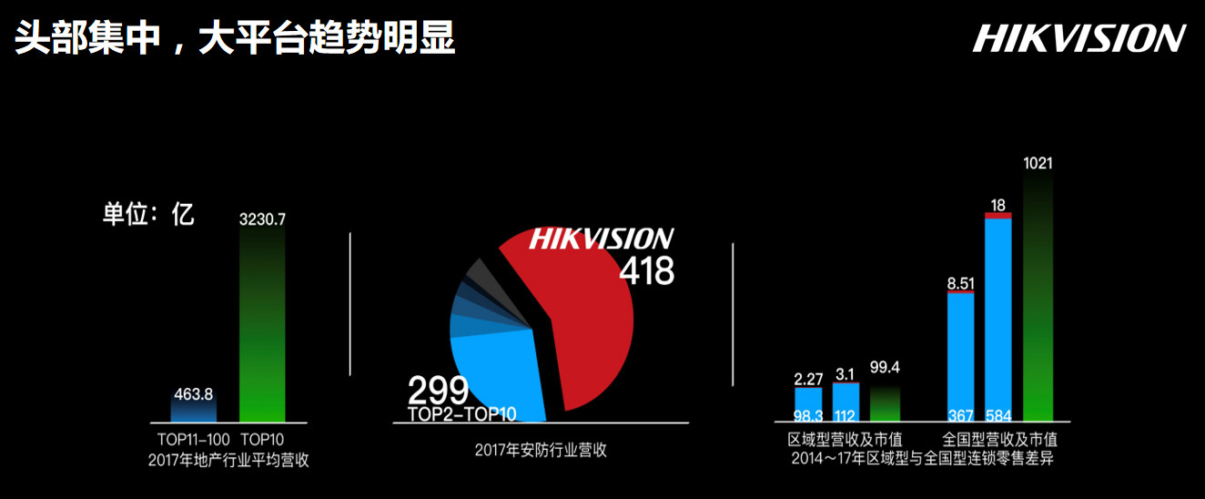 看海康威视所在的安防行业,也是各个伙伴的支持,海康威视去年营收超过418亿,后面10名加起来不到300亿。