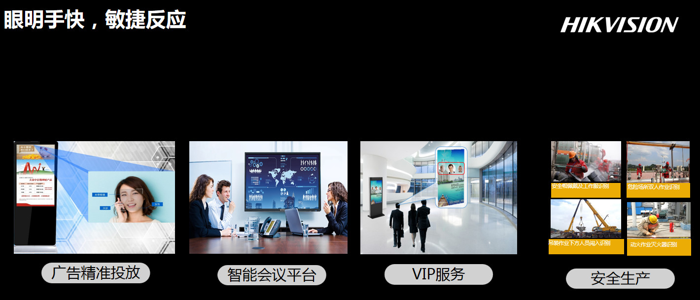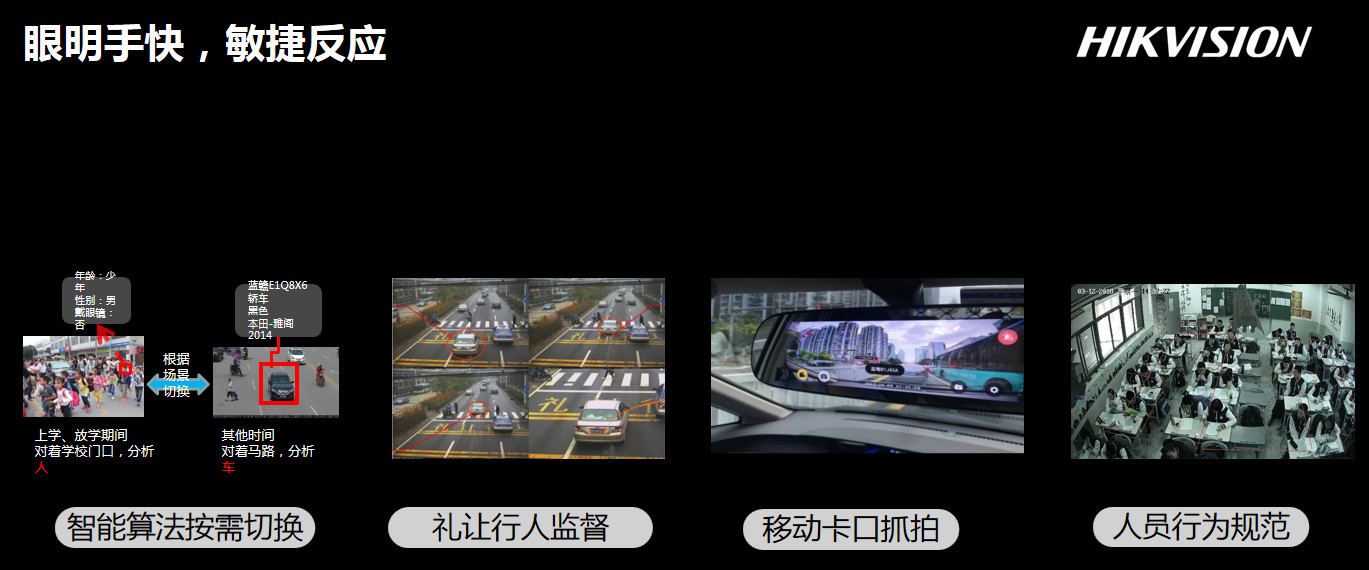 上图是不同场景下所提到的,如何让城市管理和企业经营做到敏捷反应的一些例子。比如城市中的礼让交通,不只是车让人,现在还要人让车。对于人的违法我们怎么去约束和规范化?包括移动卡口的抓拍、追逃、打拐,这里面的应用都是通过人脸、体态、行为分析来快速锁定对象。行为的分析,在会场、学校,培训场景下都会通过智能的方法和能力来规范化。
