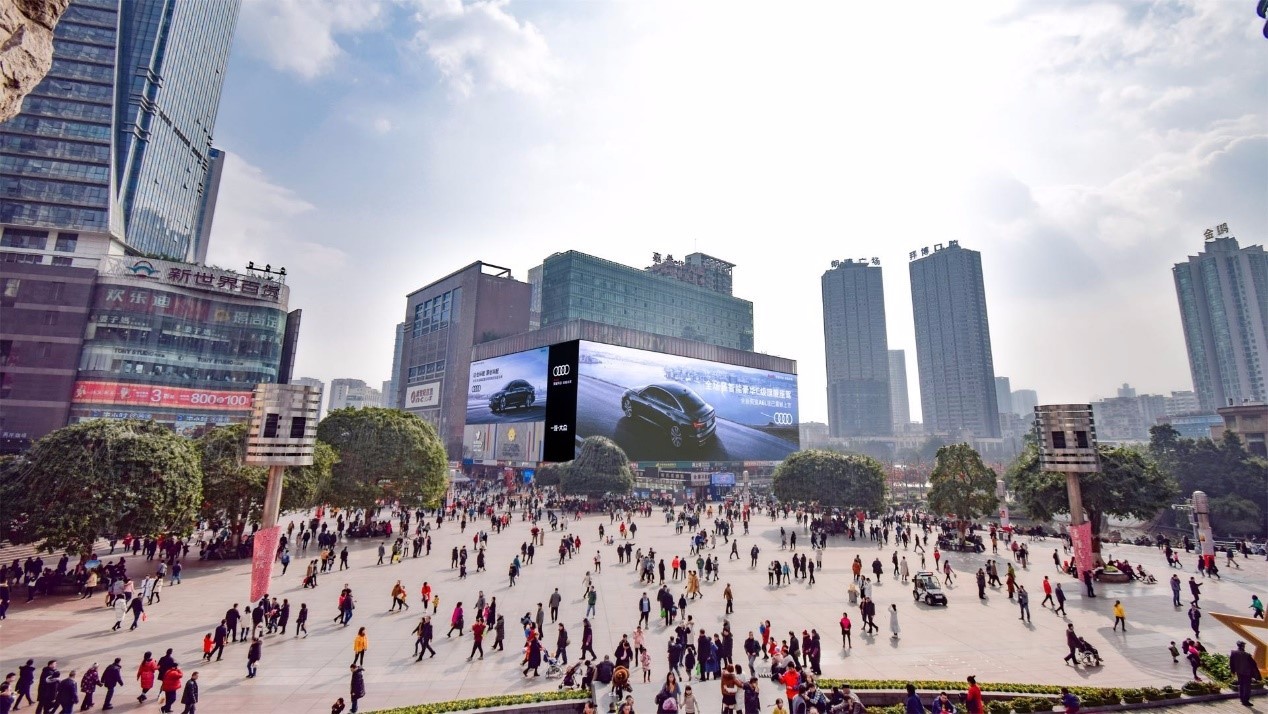 被称为「亚洲之光」的亚洲第一巨屏,地处重庆观音桥商圈中心位置,围绕苏宁易购大楼两面搭建而成。这个总面积多达3788平方米的巨型户外LED显示屏,是利亚德集团所承建项目中面积最大的户外商用LED显示项目。