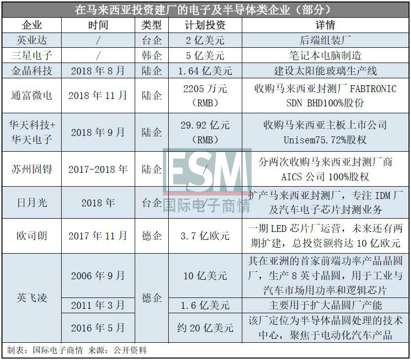 众所周知,马来西亚是东南亚的后端半导体制造中心,英特尔、英飞凌、日月光、ST等知名半导体公司均在该国建厂。2018年前后,苏州固锝、通富微电、华天科技三家中国半导体厂商先后宣布并购马来西亚的封测厂。
