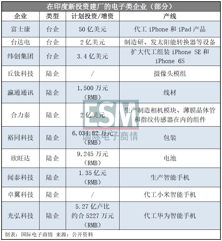印度是中国大陆和中国台湾智能手机相关产业的制造地,同时又是全球消费电子产品(特指手机)的主力消费市场。随着富士康和纬创集团的入驻,iPhone和iPad的一部分产能均在印度完成。