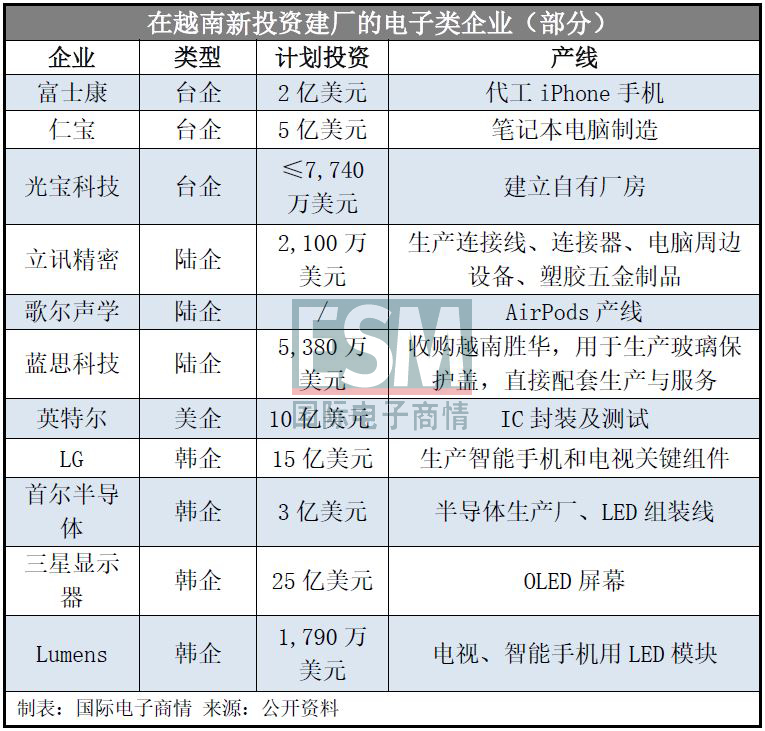 除此,英特尔的IC封测已经驻扎越南。中国大陆处于手机供应链上的关键元器件公司如立讯精密、歌尔声学、蓝思科技等或收购或建厂,陆续开进越南。