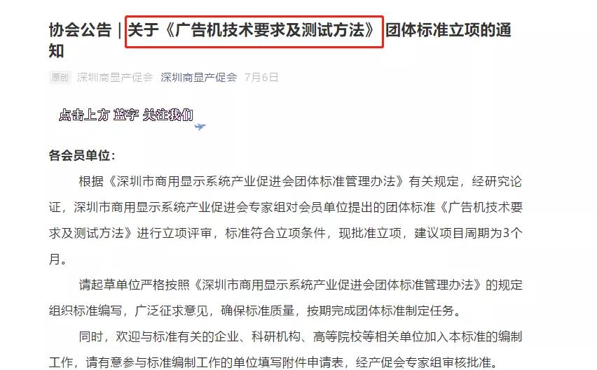 深圳商显产促会起草、发布、制定并实施这一系列的行业、团体标准规范,全面覆盖了智慧商显应用行业方方面面,将“标准先行”的思想深入人心。今年7月,深圳市商用显示系统产业促进会正式筹备启动《广告机技术要求及测试方法》团体标准立项工作,健全规范智慧户外发展,这与《纲要》中“完善专业标准化技术组织体系,健全跨领域工作机制,提升开放性和透明度”的精神不谋而合。更将团标先行作为国行标及国际标准做好必要的“蓄水池”。