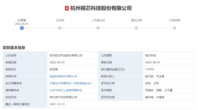 6月1日,又据集微网消息,深圳证券交易所正式受理了杭州视芯科技股份有限公司(以下简称“视芯科技”)创业板上市申请。