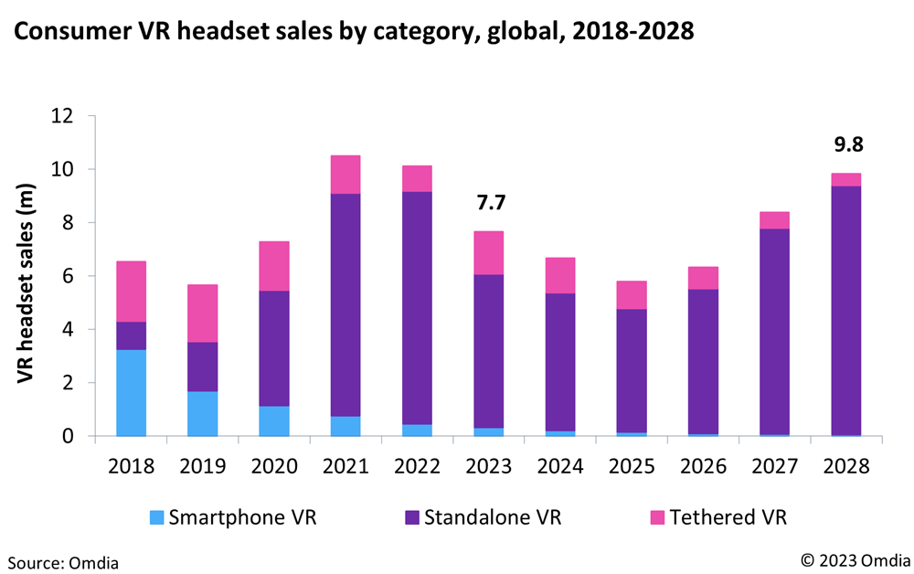 多种因素共同导致了2023年的惨淡表现。通胀压力影响了消费者支出,且2021年新冠疫情大流行引发的峰值逐渐下降,更是令其雪上加霜。此外,Meta Quest 3、索尼PlayStation VR2(PSVR2)和 Pico 4三款关键头显设备的表现不佳,加剧了2023年的市场低迷情况。