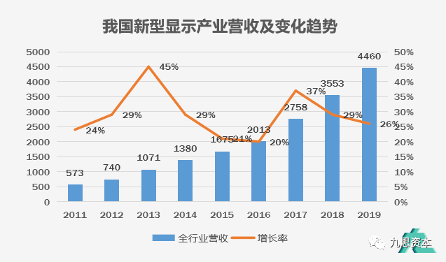 我国的光电行业起步较晚,只在近20年才得到较快的发展。近十年内,国内的光显示、LED、激光、光学元器件等细分领域的市场规模增长了10倍。目前光电概念产业在全球已突破万亿级别的规模,其中光显示占比超过30%,我国2018年新型显示产业营收已达3553亿元,年均增长率超过20%。