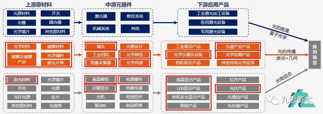 光电产业主要分为三个方向:几何光学与波动光学为主的传统光学主要涉及光的传播与感知,该部分衍生出主要产业化应用集中于视觉产业、镜头镜片、光学仪器等;量子光学主要与光的能量相挂钩,主要涉及的是激光产业在不同领域的应用;其他大部分光学产业化应用主要集中于光电结合等其他融合方向,包括光电显示、光存储、光计算等。