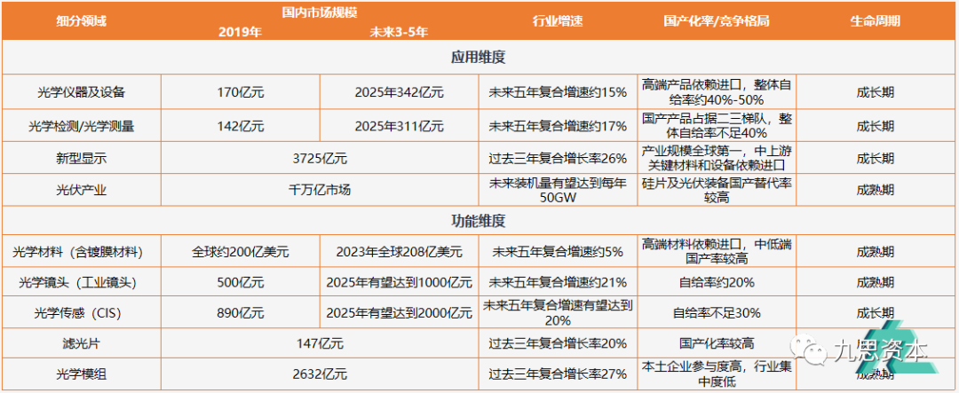 纵览光电行业产业链上中下游,其中中上游为高核心价值的环节,从应用维度和功能维度考量,测算市场规模如下: