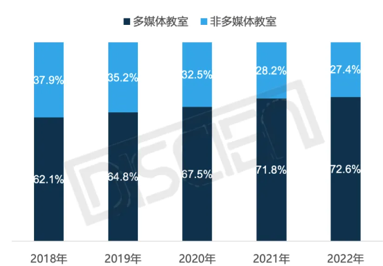 市场空间:根据教育局统计,2022年各类教室有868.7万间教室,较2021年增长3.5%,其中多媒体教室共有633.0万间,较2021年增长4.7%,多媒体教室占整体教室的比重为72.6%,较2021年增长0.6%。
