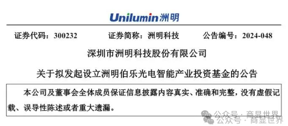 4月22日,洲明科技发布公告,宣布公司拟以全资子公司深圳市前海洲明基金管理有限责任公司与深圳市时代伯乐创业投资管理有限公司、政府引导基金、社会投资者与金融机构共同联合发起设立总规模为人民币5亿元的产业投资基金。基金名称暂定为洲明伯乐光电智能产业投资基金合伙企业(有限合伙),将重点投向新型显示技术、虚拟现实、人工智能、物联网等与洲明科技产业链具有协同性的产业领域。(新浪网)
