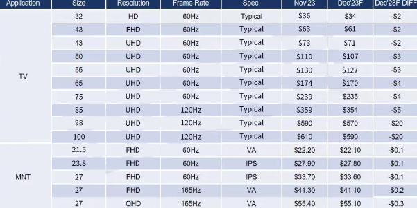 综合供需两端情况来看,目前处于面板采购淡季周期加上需求前景并未明朗,部分品牌面板采购量开始做向下调整;而供应端在经营承压下各面板厂均加大控产力度减少供应规模来实现稳价,供需双方之间博弈加剧。DISCIEN认为在此背景下12月份MNT主流尺寸面板价格在承压下开始下行。