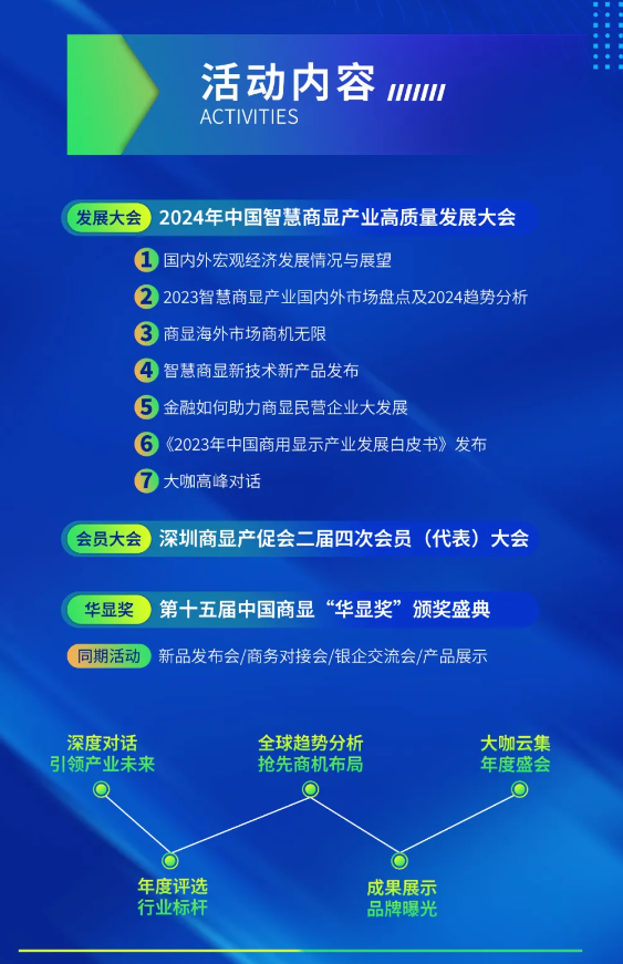 会议同期还将举办“第十五届中国华显奖颁奖盛典”以及“2024深圳商显产促会二届四次会员(代表)大会”,旨在对协会2023年工作进行总结,对2024年重点工作进行梳理和布署,并表彰最新一批驱动智慧显示产业发展的功勋人物、领军企业、先进产品技术及创新解决方案,树立行业标杆,引导行业高质量可持续发展。