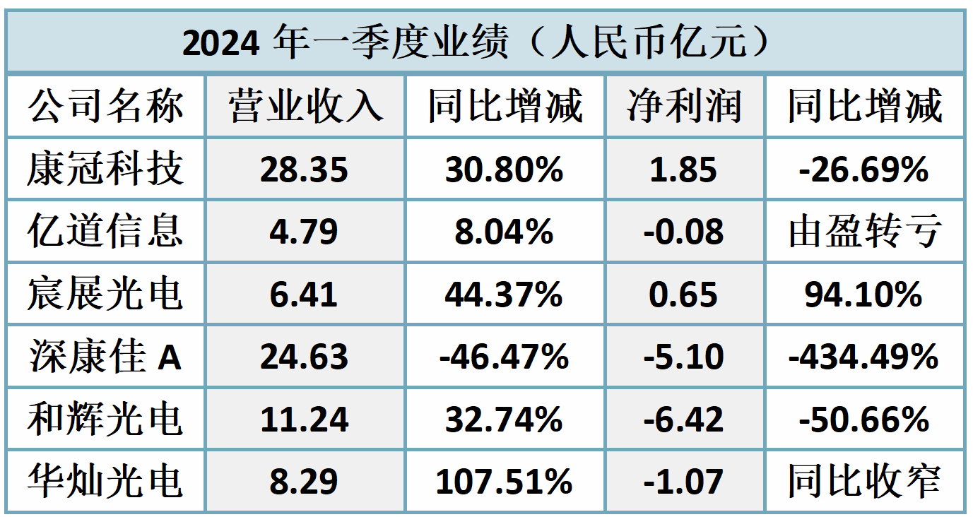 近日,康冠科技、亿道信息、宸展光电、深康佳A、和辉光电、华灿光电公布2024年一季度业绩报告。其中,宸展光电营收净利双增;康冠科技实现营业总收入28.35亿元,同比增长30.80%。