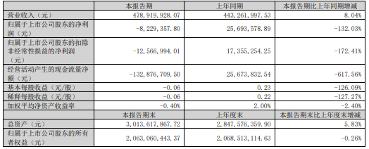 亿道信息一季度营业收入4.79亿元,同比增长8.04%。归属于上市公司股东的净亏损822.9万元,同比由盈转亏。归属于上市公司股东的扣除非经常性损益的净亏损1256.7万元。基本每股收益-0.06元。