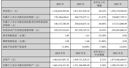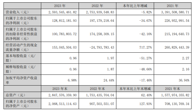 同日,宸展光电公布2023年年报。报告显示,2023年,公司实现营业总收入13.37亿元,同比下降26.22%;归母净利润1.78亿元,同比下降31.67%;扣非净利润1.40亿元,同比下降44.08%;经营活动产生的现金流量净额为4.59亿元,同比增长18.55%;报告期内,基本每股收益为1.09元。业绩变动的主要影响因素为主要客户在2023年一季度开始进行库存调整、年毛利率2022年增加3.22%、汇兑收益大幅减少所致。