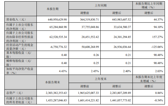 宸展光电一季度营业收入6.41亿元,同比增长44.37%;归母净利润6528.49万元,同比增长94.10%;扣非净利润6252.05万元,同比增长157.27%;基本每股收益为0.4元。