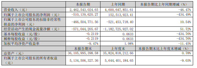 深康佳A 一季度营业收入24.63亿元,同比下降46.47%;归母净利润亏损5.10亿元,上年同期盈利1.53亿元;扣非净利润亏损4.67亿元,上年同期亏损5.21亿元;报告期内,基本每股收益为-0.2119元。