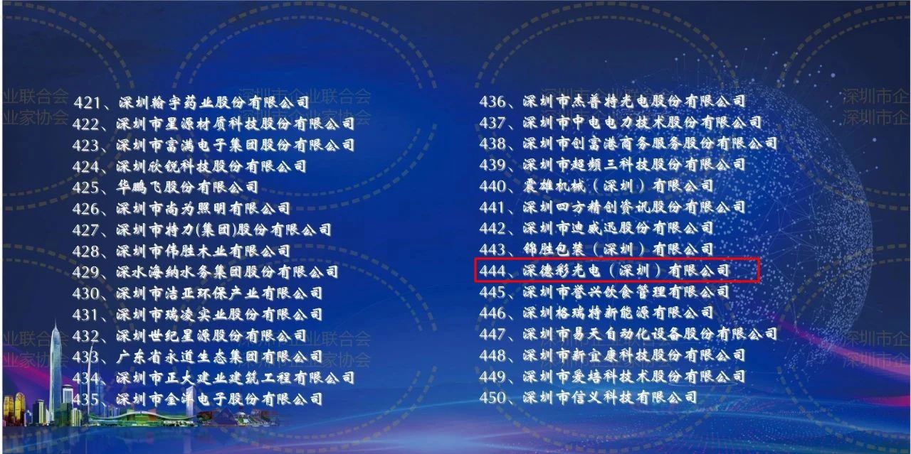 3 ÉîµÂ²Ê ÉîµÂ²Ê¹âµç£¨ÉîÛÚ£©ÓÐÏÞ¹«Ë¾£¨ÏֹɷÝÖÆ¸Ä¸ïºóÒѸüÃûΪÉîµÂ²Ê¿Æ¼¼£¨ÉîÛÚ£©¹É·ÝÓÐÏÞ¹«Ë¾£©±»ÆÀΪÉîÛÚ500Ç¿ÆóÒµ£¬½ìʱ½«ÓÉÉîÛÚÊÐÕþ¸®¾ÙÐÐÊ¢´óµÄÊÚÅÆÒÇʽ²¢ÎªÉîµÂ²ÊÊÚÓè500Ç¿Æó񵁮ØÒ¡£