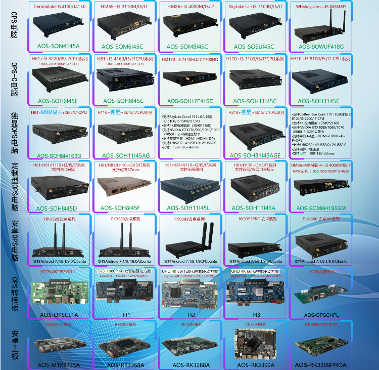 OPS电脑:Baytrail J1800/J1900/Baytrail-CR Z8350/GeminiLa ke N4000/J4105 CPU/HM76+2-3 代CPU/HM86+4代CPU/Skylake-u+6-7 代CPU/Whiskeylake-u+8-9代CPU。