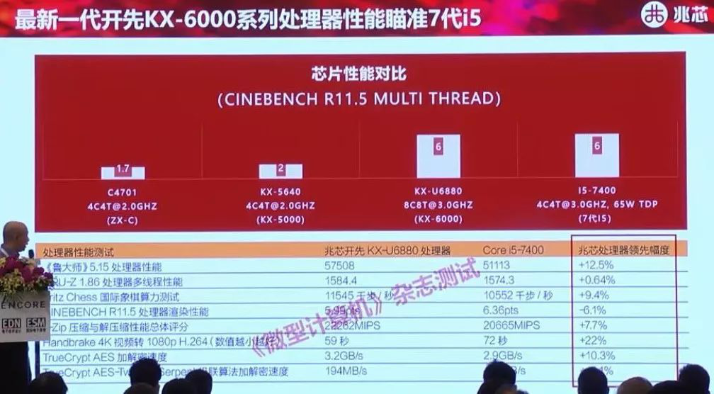 兆芯已经研发出四代CPU,从40nm、28nm到目前的16nm,CPU主频也从小于2G发展到现在的3G。预计今年6月份推出的KX-6000系列性能已经接近英特尔的7代i5。在去年的上海工博会上,《微型计算机》杂志对KX-6000工程样机(3.0G主频和八核)做了第三方评测。最后得出的结论是跟英特尔第八代I5基本上不相上下。
