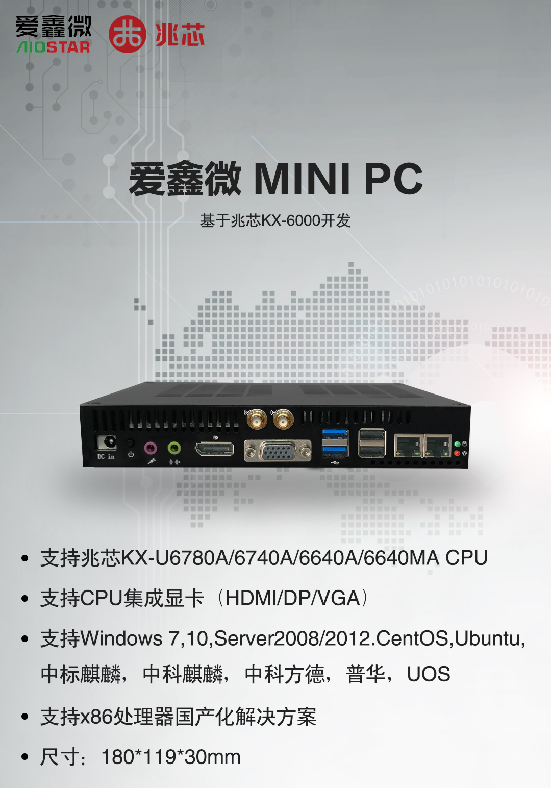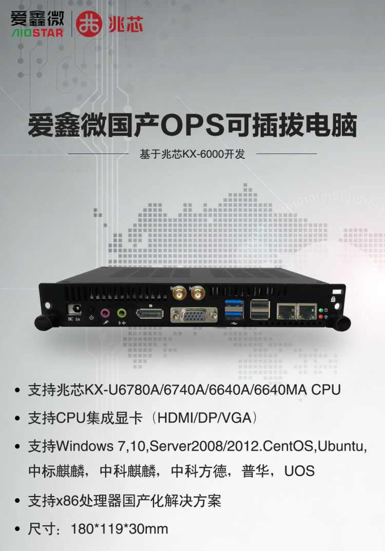爱鑫微电子针对国产化市场的需求,推出来了一系列基于兆芯KX-6000系列的国产化硬件产品:兆芯OPS电脑、兆芯独显OPS-C插拔式电脑、兆芯迷你电脑、兆芯商用主机等国产化产品化。