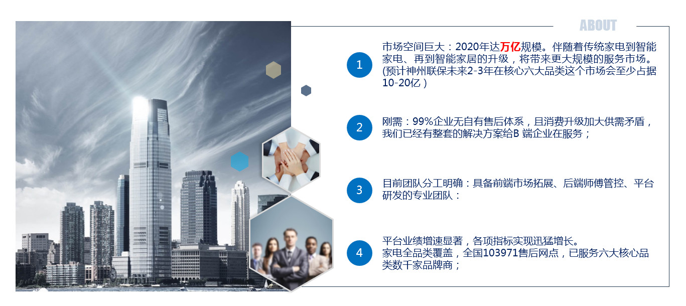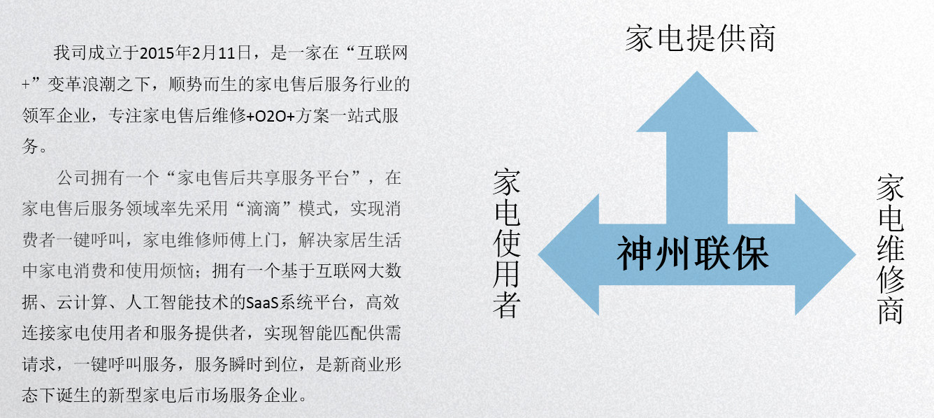 神州联保拥有一个基于互联网大数据、云计算、人工智能技术的SaaS系统平台,高效连接家电使用者和服务提供者,实现智能匹配供需请求,一键呼叫服务,服务瞬时到位,是新商业形态下诞生的新型家电后市场服务企业。