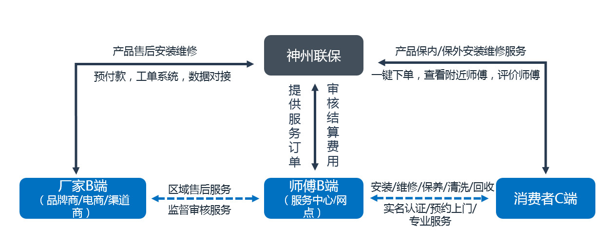 神州联保拥有一个「家电售后共享服务平台」,在家电售后服务领域率先采用「滴滴」模式,实现消费者一键呼叫,家电维修师傅上门,解决家居生活中家电消费和使用烦恼。